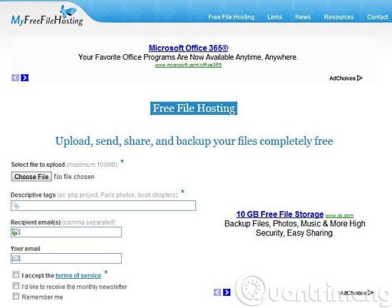Đến với dịch vụ miễn phí MyFreeFileHosting, bạn có thể nhanh chóng chia sẻ tài liệu cho bạn bè qua mạng Internet với tốc độ tải rất nhanh. Ở đây, bạn sẽ dễ dàng tải các tập tin cần thiết lên máy chủ của dịch vụ, sau đó đợi để nhận lại các liên kết tải về được gửi qua email đã thông báo.