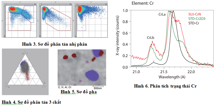Phân tích pha tạo ra độ mạnh (nồng độ) trên sơ đồ phân tán như một tập điểm (cluster), biểu diễn chính xác từng pha hợp chất. Hình 3 cho thấy kết quả của việc tách C-Cr, N-Cr, và N-Al thành các sơ đồ phân tán nhị phân. Các hợp chất này là chromium carbide, chromium nitride, và aluminum nitride, được xác định tương ứng với vùng tím, nâu và đỏ tươi trong hình 5.
